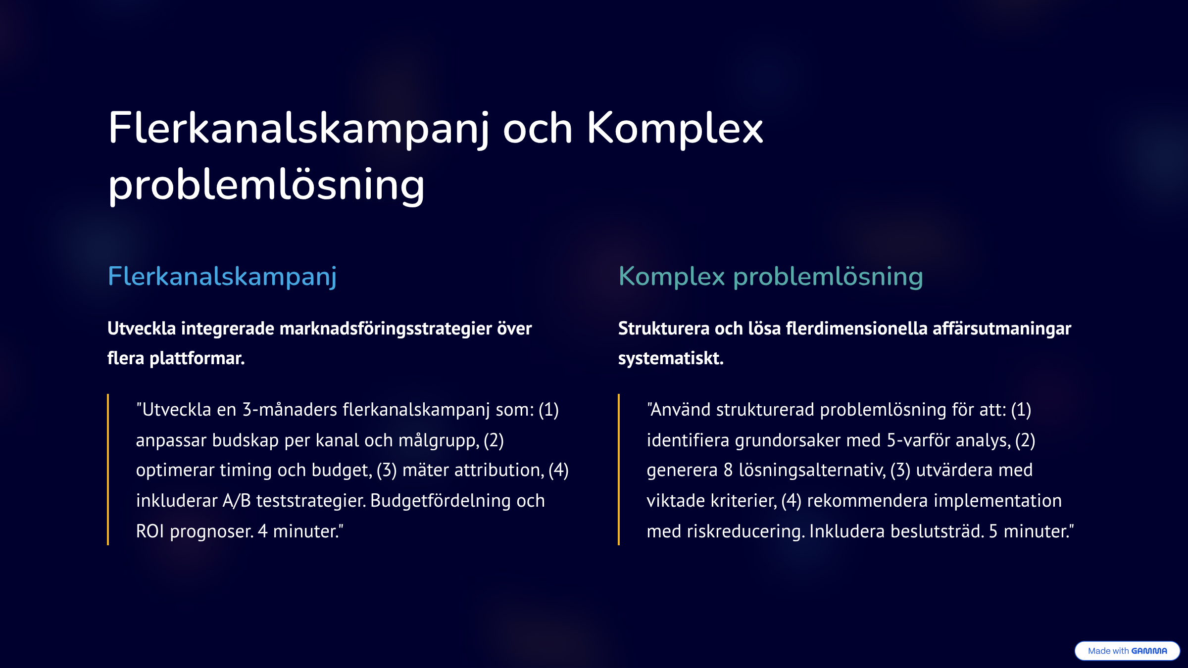 Varje prompt är designad för resultat inom 2-5 minuter – längre än vanliga AI-uppgifter, men anpassat för verklig professionell komplexitet.
