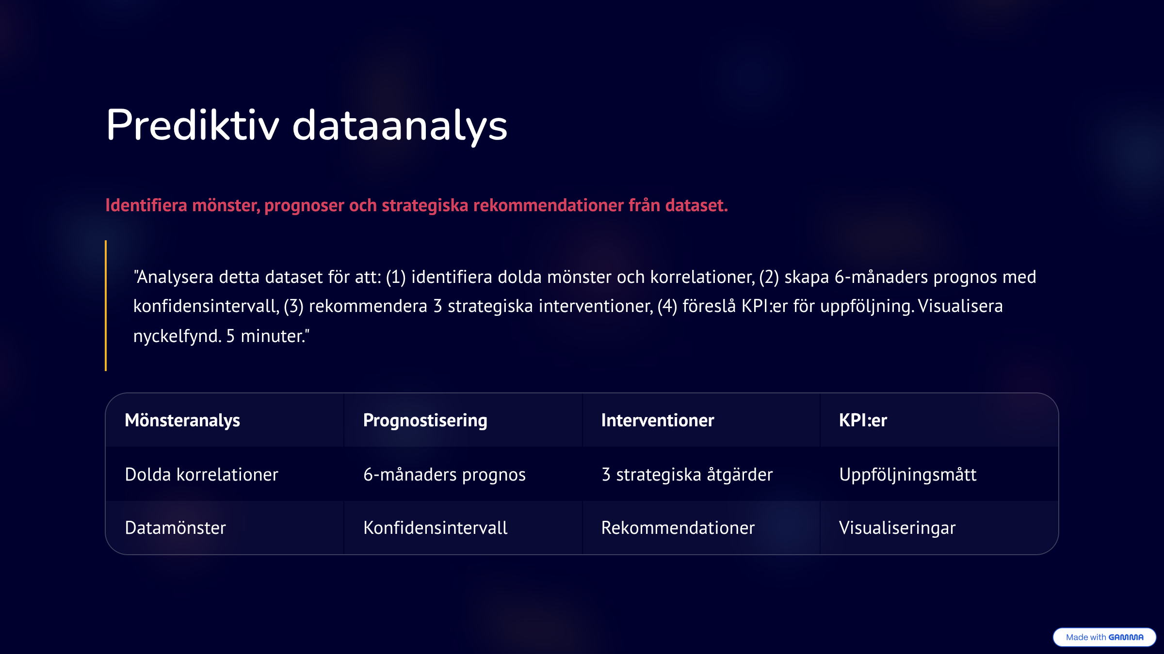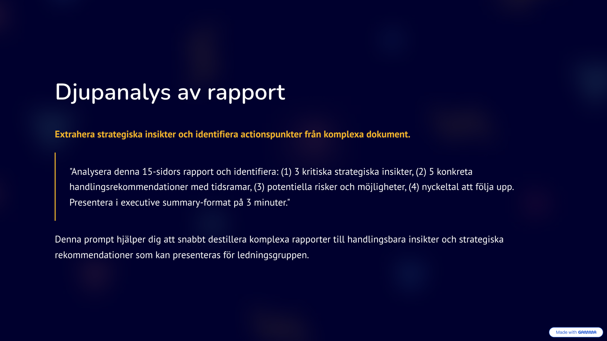 Samlingen består av tio kategorier som täcker allt från djupanalys till komplex problemlösning. Istället för att bara be AI:n "sammanfatta denna rapport" får du strukturerade instruktioner som levererar strategiska insikter, actionspunkter och riskbedömningar.